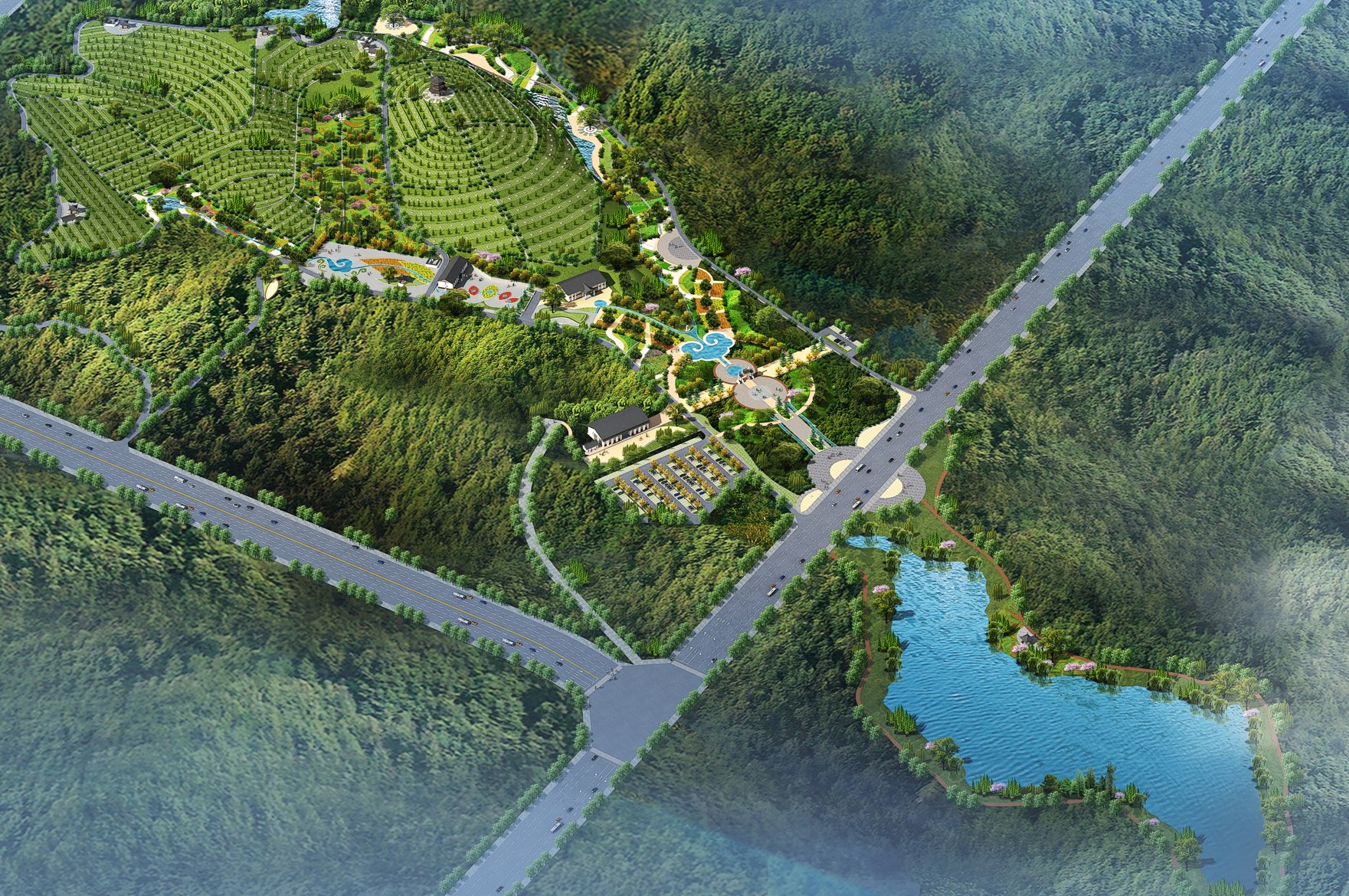 德龍陵園來龍于昆侖山系,屬翠峰山主脈延伸到石馬龍山的團山結穴而建,面朝小閘水庫,太和山與寥廓山左右環(huán)抱,園區(qū)巒聳翠、水映霞輝、山環(huán)水繞、郁郁蔥蔥,有五龍捧圣之勢,冠以五福臨門之愿,五德傳承之感,使山水人文融為一體,是弘揚中華文化的教研基地。