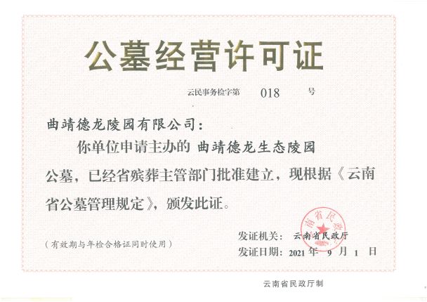德龍園聚翠山之靈秀,依文脈而規(guī)劃,經(jīng)云南省民政廳批準(zhǔn)建設(shè),規(guī)劃用地一共520畝,經(jīng)過精心設(shè)計,精細(xì)施工,于2021年9月取得《公墓經(jīng)營許可證》并投入使用。